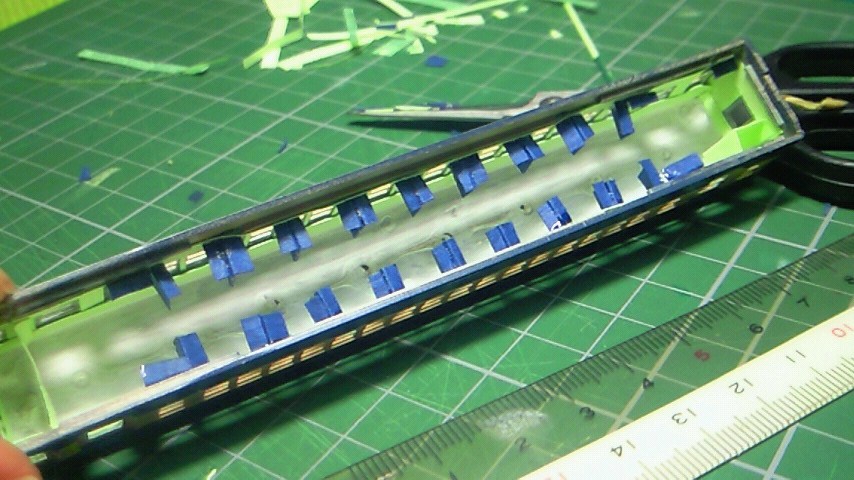 工程自体は簡単なのですが、単調作業のため、集中力が続きません・・・。とりあえず1両ふだけでも、と自分に言い聞かせて作りました。