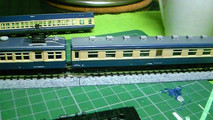 落成間近のサハ75の床下を仮に取り付け、こちらはまだ内装着手していないクモハユニと連結(実際にはあり得ないコンビですが・・・)して、ボディマウント化したTNカプラーの連結面感覚などを微調整してゆきます。